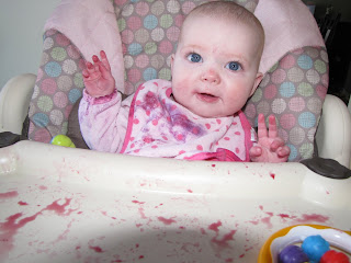 I tried it with Little Miss at around 5 months, however she was clearly not ready. I had placed a piece of pear in it (it was all I could find) and she picked it up, put it down and just didn't care. Last week I decided to try again and came up with the brilliant idea that I'd use frozen fruit. It would be nice and cold already, and easy to squah into the bag. Into the freezer I went to find a bag of mixed berries. Now any of you with any common sense may see where this is going, but I, in my infinite naivete, did not.