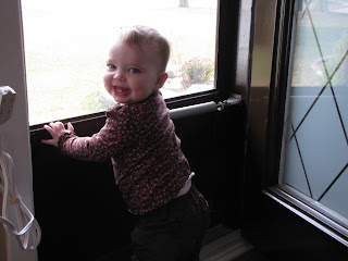 Although she's not yet walking, she is so close, and will pull herself up with one hand using my pant leg or a piece of furniture. Right now I think she's more cautious than anything, and when she does decide to get somewhere, she gracefully drops to her knees and off she goes. It's much better than when she first learned to stand and she would drop to her bum rather forcefully causing us to cringe...thank goodness for puffy diapers!