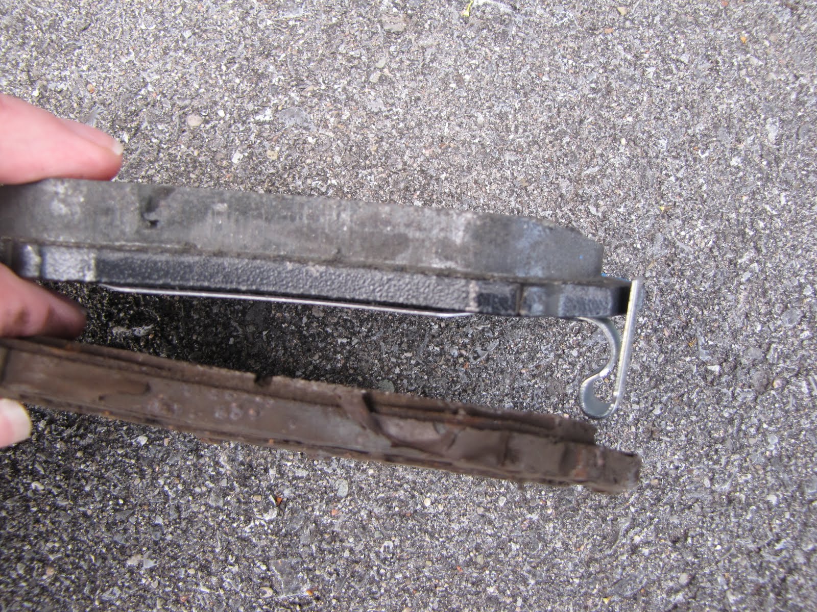 Ahh yes. So our car was squealing very loudly for a few days. It got worse and worse. I decided to take it to a mechanic when it got to a point that I was slouched down in my seat with a ball cap tilted so people couldn't see my face as I drove. It was that bad. I was going to book it an appt, but first decided to check with some other folks - my facebook friends. I posted a message on FB asking what could be making that terrible front end squealing. Within minutes I had 5 women respond (yes all women!) that it could be the brakes, rotors or a belt. I knew the tires needed replacing and the brakes would be needing replacement soon, however it didn't make the sound when braking. I was informed that brakes come with 'squealers" (Not sure if that's the name for it but whatever) that squeal when you need new brakes. Ummmm isn't that what grinding is for? I never replaced brakes before until they'd start grinding and shuddering while braking. Apparently that's not cool. No wonder my cars fell apart. Sooo this weekend my hubby bought new brake pads and rotors and replaced ours. Here is the pic of the old with the new (you figure out which is which). The thickness of the pad on the top is crazy compared with the tiny sliver left on the bottom one. I am happy to report that the squeal is gone and we no longer have to pound on the brake petal. In fact my seatbelt came in handy when I almost went through the windshield when stopping at a light. Thanks honey!
