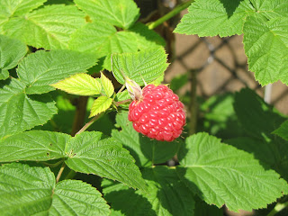 Lookit what I grew!!! Okay, there was no effort - the plants came with the house but I love them! We get fresh raspberries every day - this is the first one this year! Yummy!