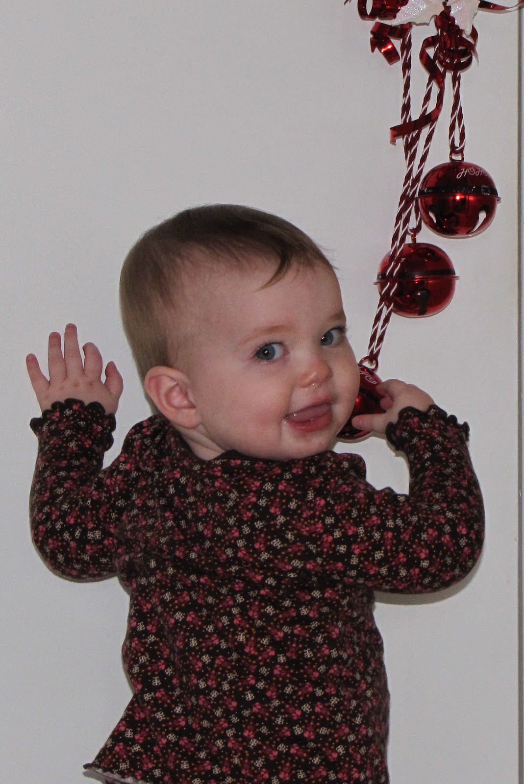 Although she's not yet walking, she is so close, and will pull herself up with one hand using my pant leg or a piece of furniture. Right now I think she's more cautious than anything, and when she does decide to get somewhere, she gracefully drops to her knees and off she goes. It's much better than when she first learned to stand and she would drop to her bum rather forcefully causing us to cringe...thank goodness for puffy diapers!